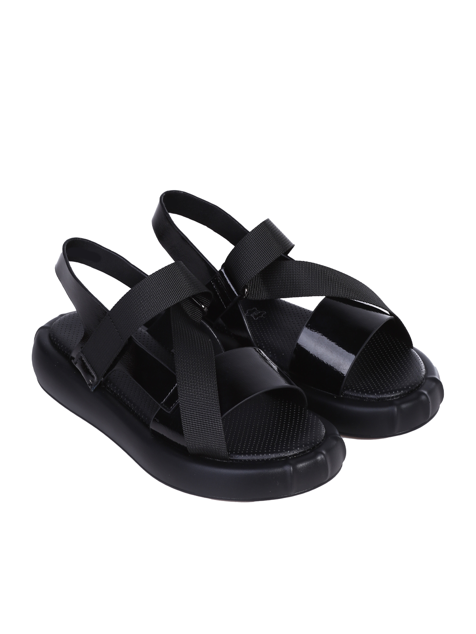 Ежедневни дамски сандали от естествен лак и текстил. Предлагат се в черен цвят, с велкро закопчаване. Вътрешната част е от естествена кожа.